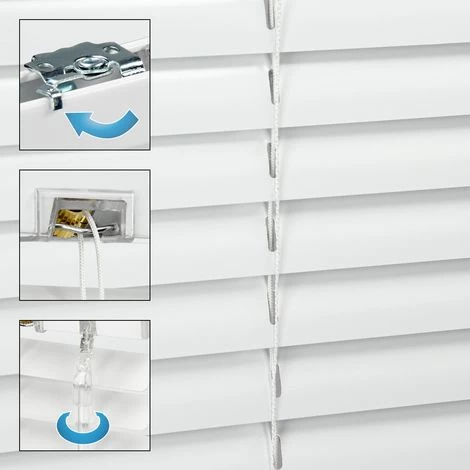 Côté de commande – droite: cordon de serrage (couleur assortie à la couleur de la lamelle), barre de retournement (plastique, semi-transparent, environ 61 cm de long).