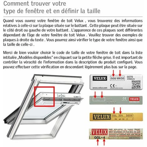 L’apparence du type et de la taille de la fenêtre peut varier selon le modèle de fenêtre de toit VELUX que vous possédez, mais le format est toujours le même : d’abord le type, puis la taille de la fenêtre.